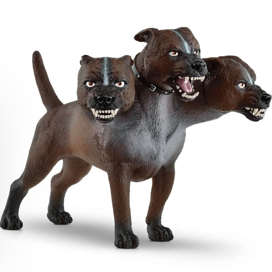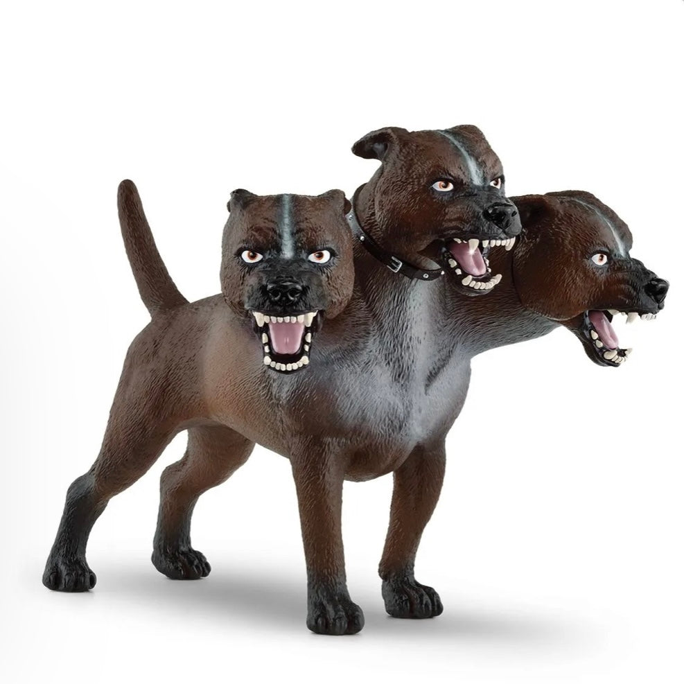 Fluffy wears a collar around the middle of his three heads. His ears are laid back aggressively and his sharp teeth should not be underestimated.