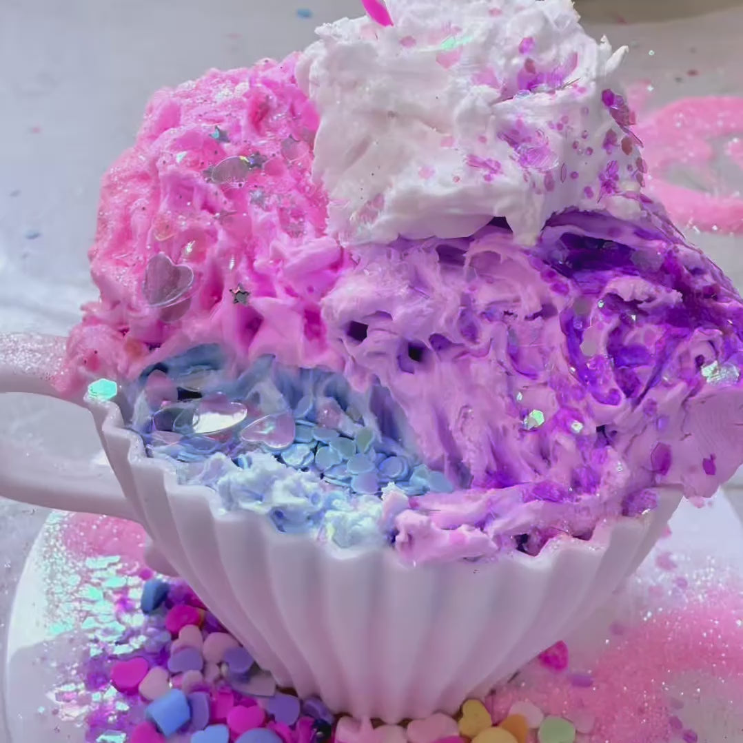 💕Texture: DIY-thin and glossy base plus tea cup clay pieces creates an extra fluffy, poofy, soft and inflating slime