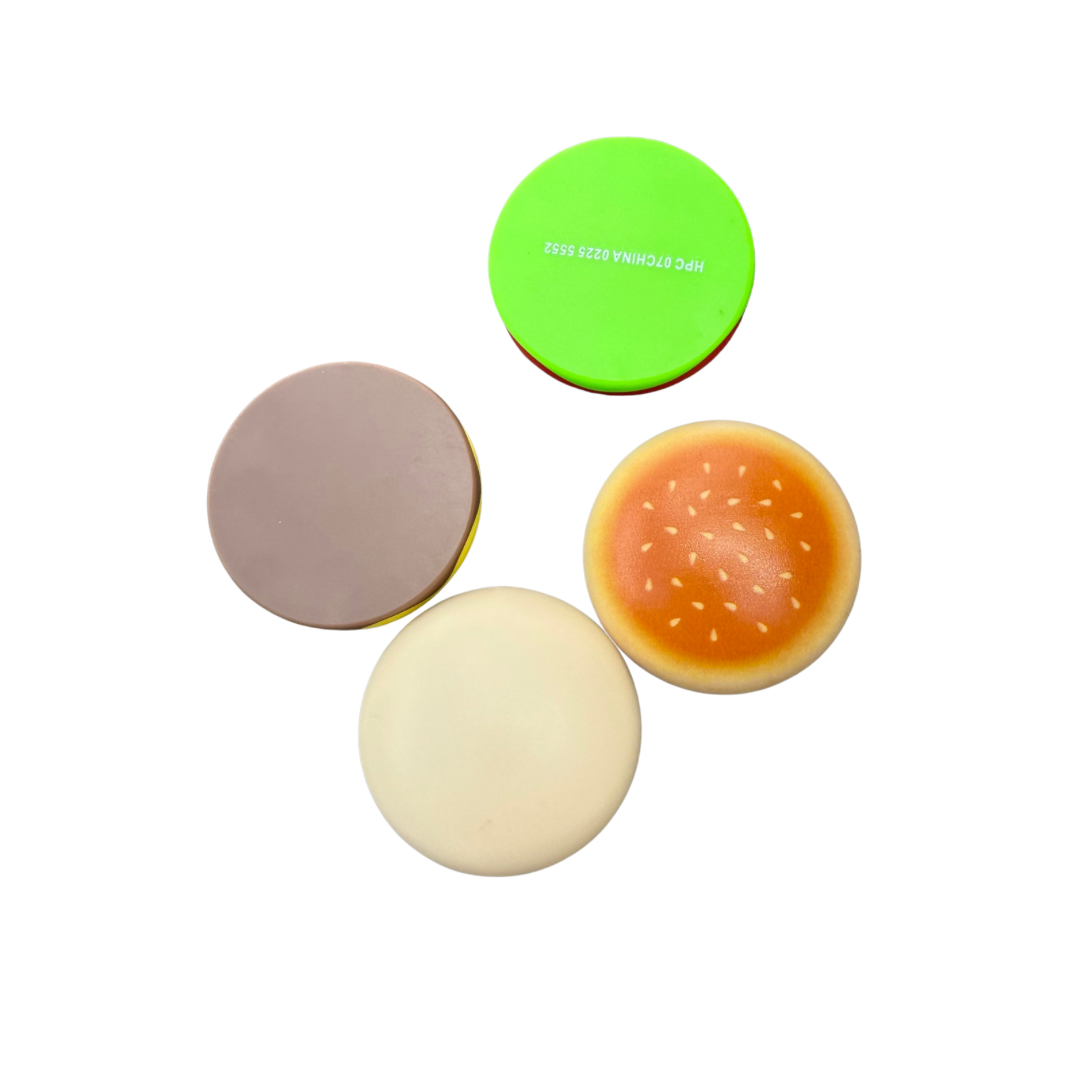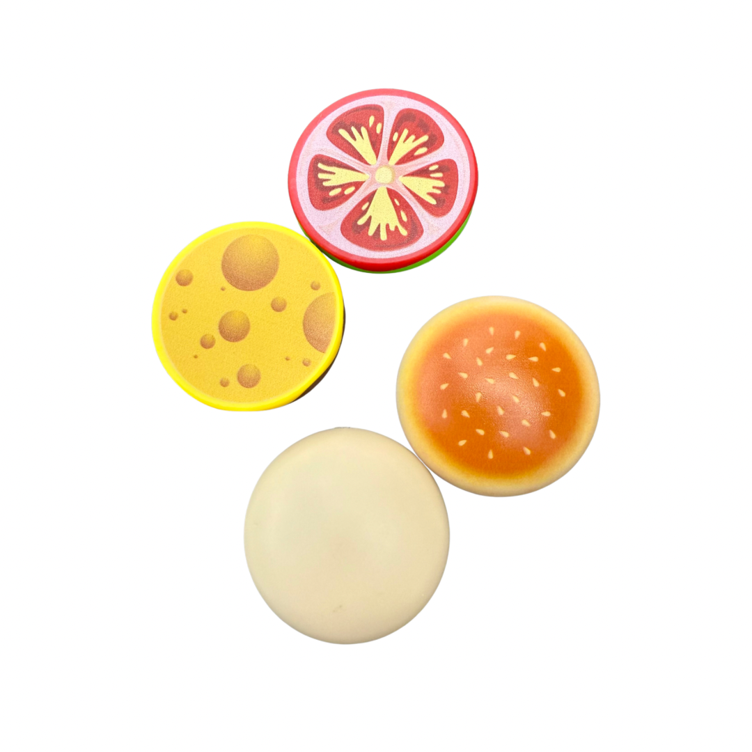 - Includes 4 pieces, 2 Buns 1 burger/cheese and 1 lettuce/tomato