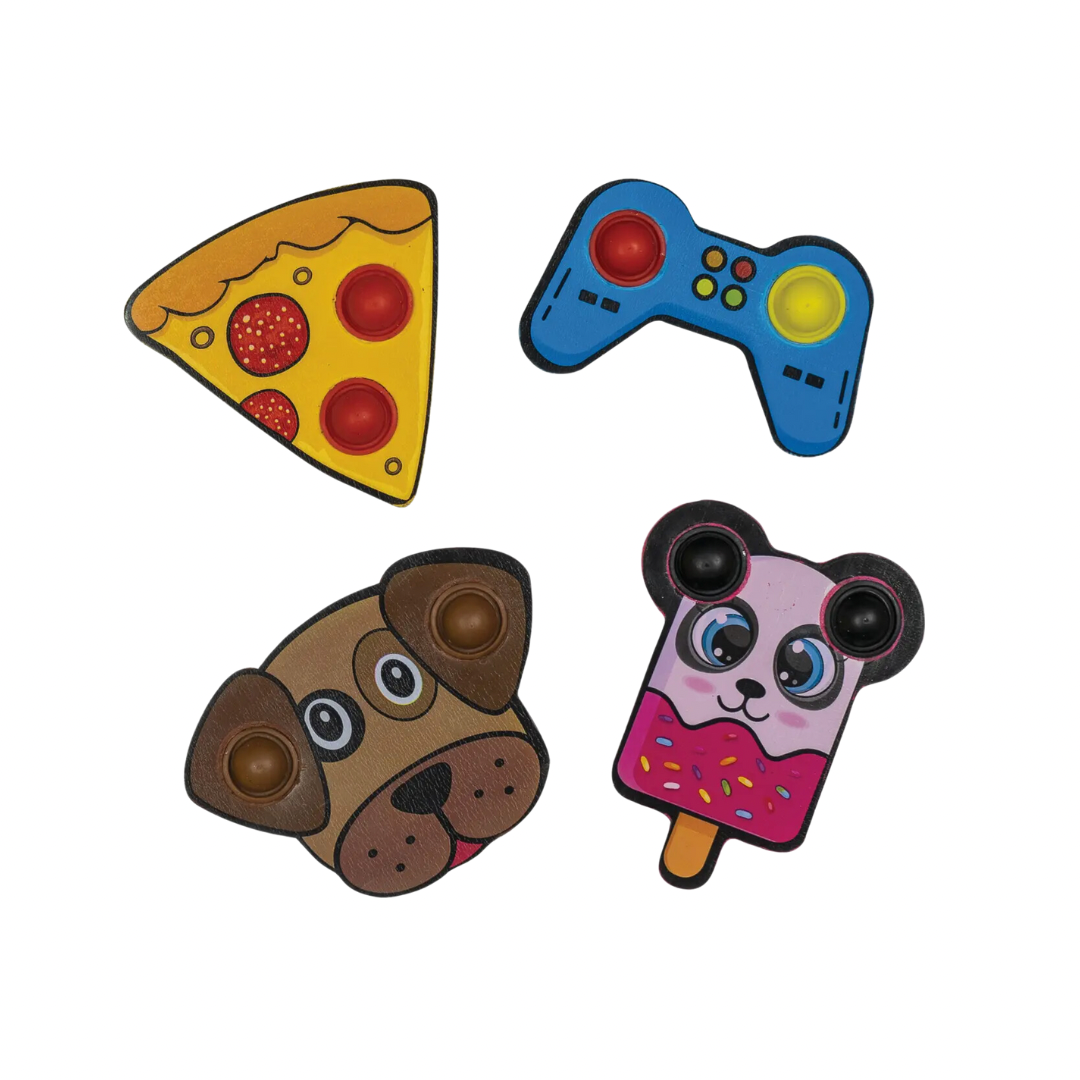 Designs include: pepperoni pizza, game controller, panda pop, and puppy face. Approx. 3" in size. 1/4" thick 24/